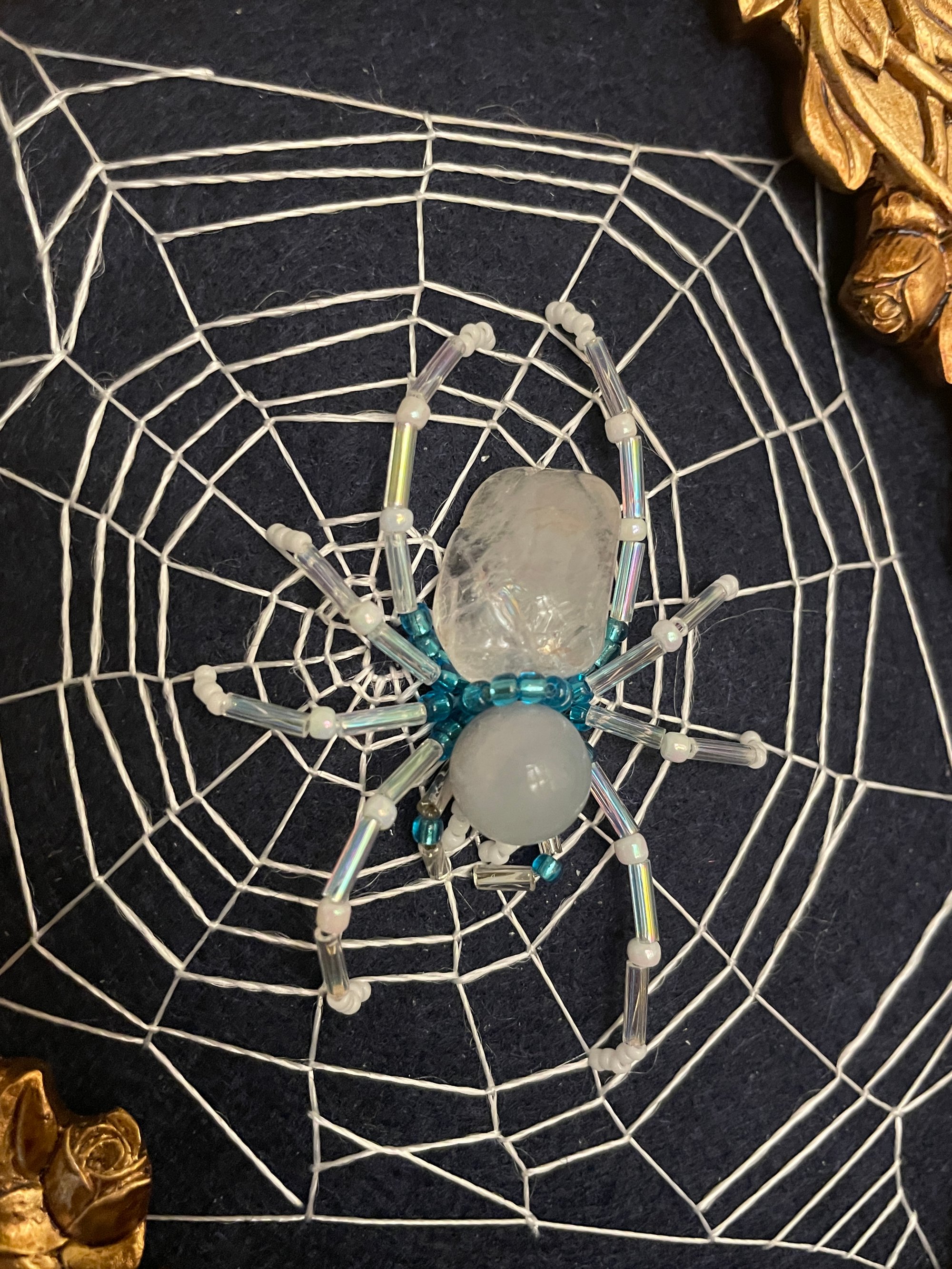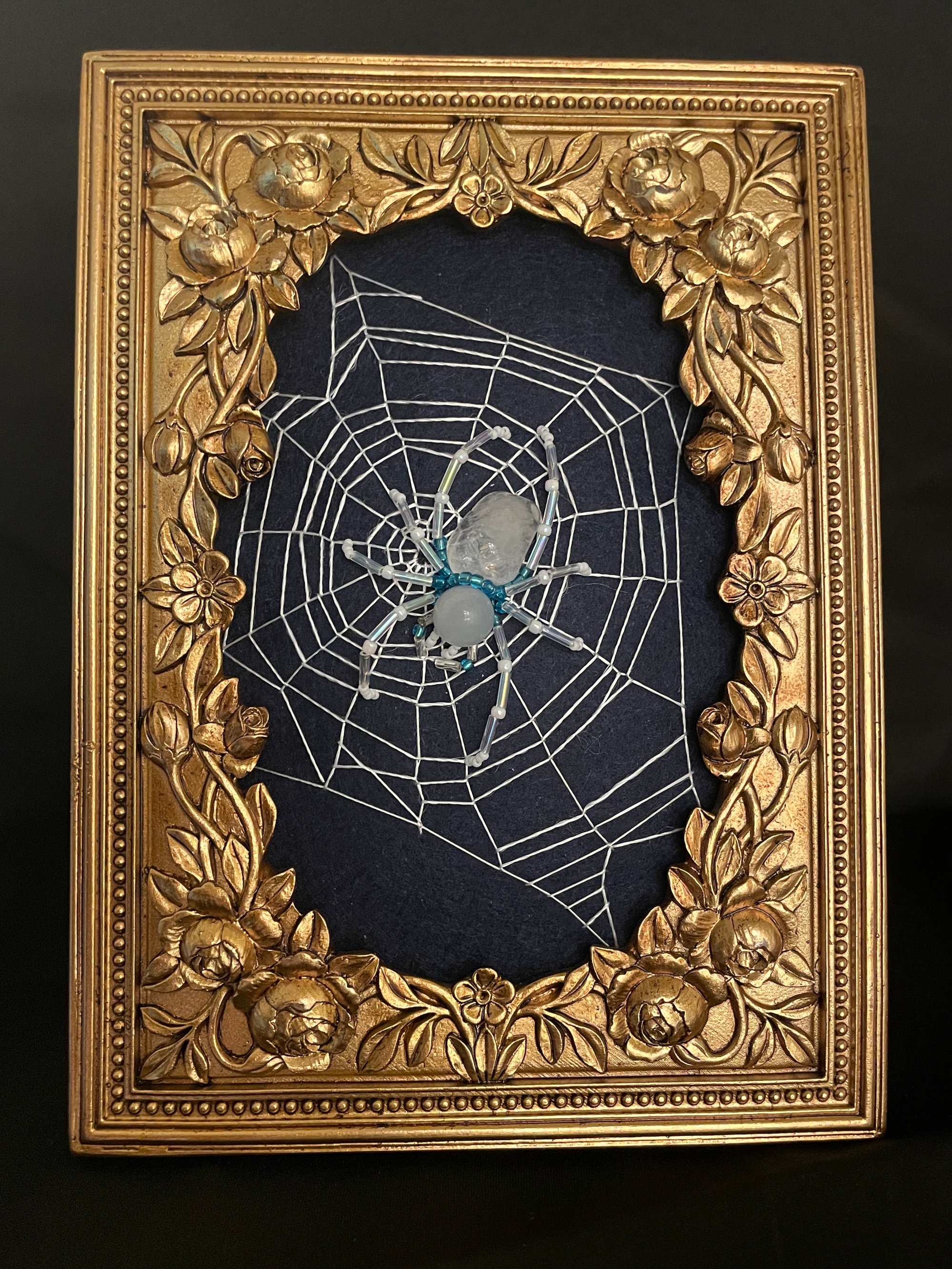 Gold floral framed spider on navy blue felt. This spider is a special girl made from a blue aventurine and a polished Cape May Diamond straight from the shores of my home. She rests on white, hand embroidered webbing.