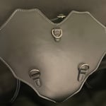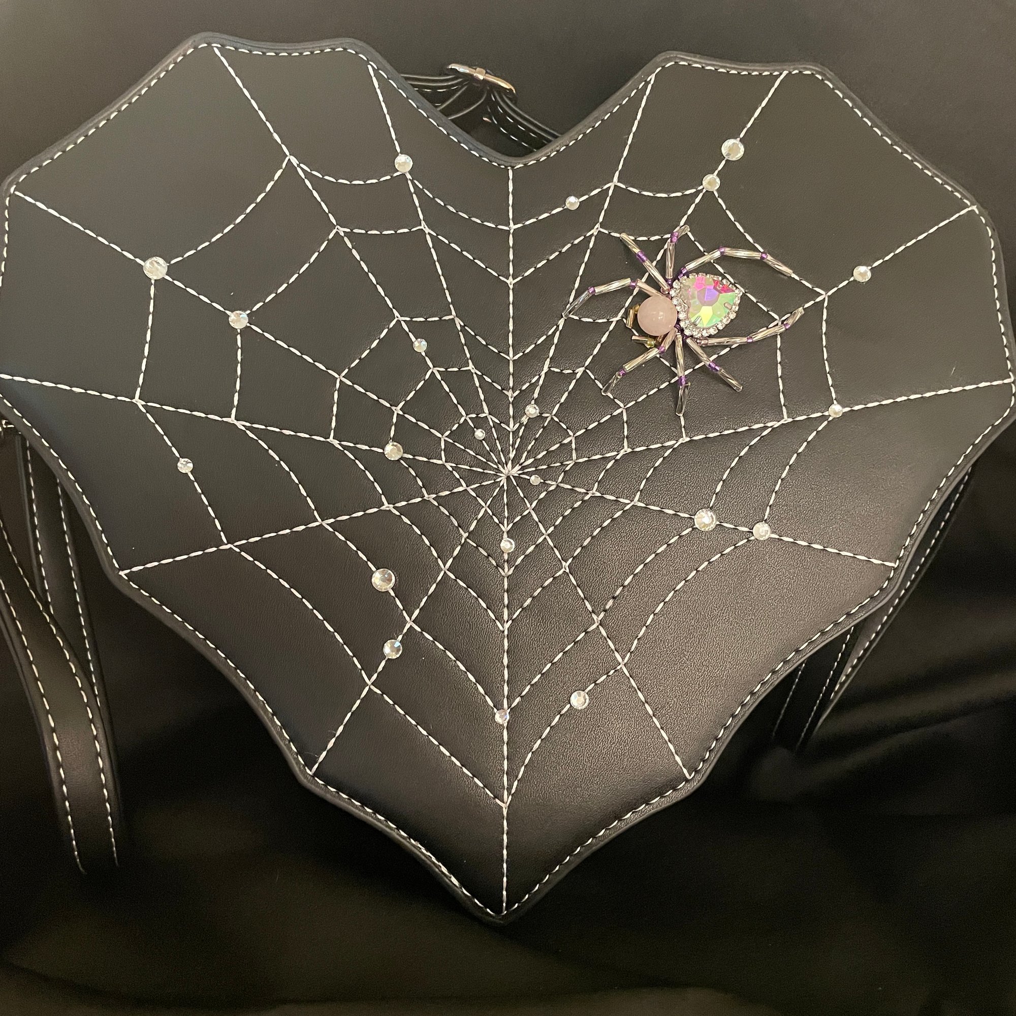 Heart shaped faux leather bag with machine embroidered web detail. Can be over the shoulder with single strap and also includes second strap to convert to a book bag.