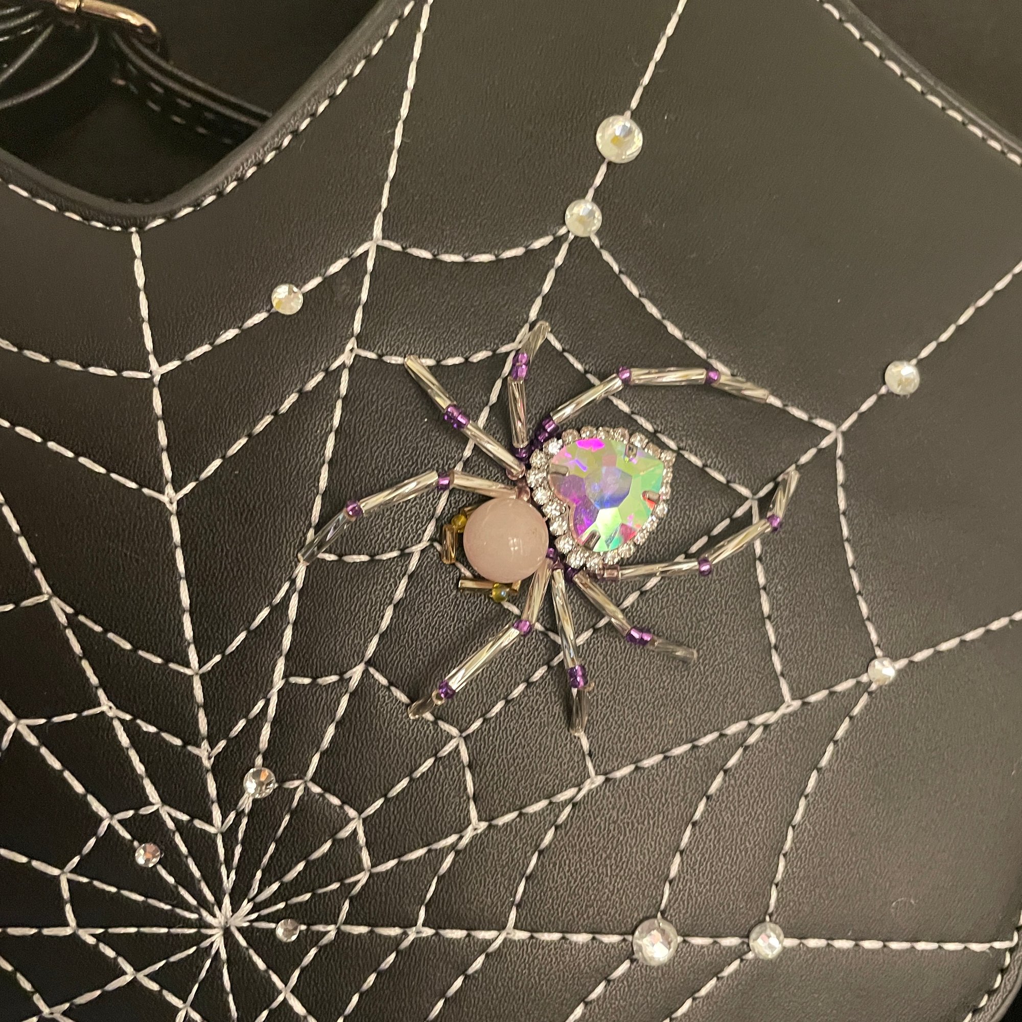 Hand embroidered beaded spider adorns the front along with hot fixed glass gems for added sparkle!