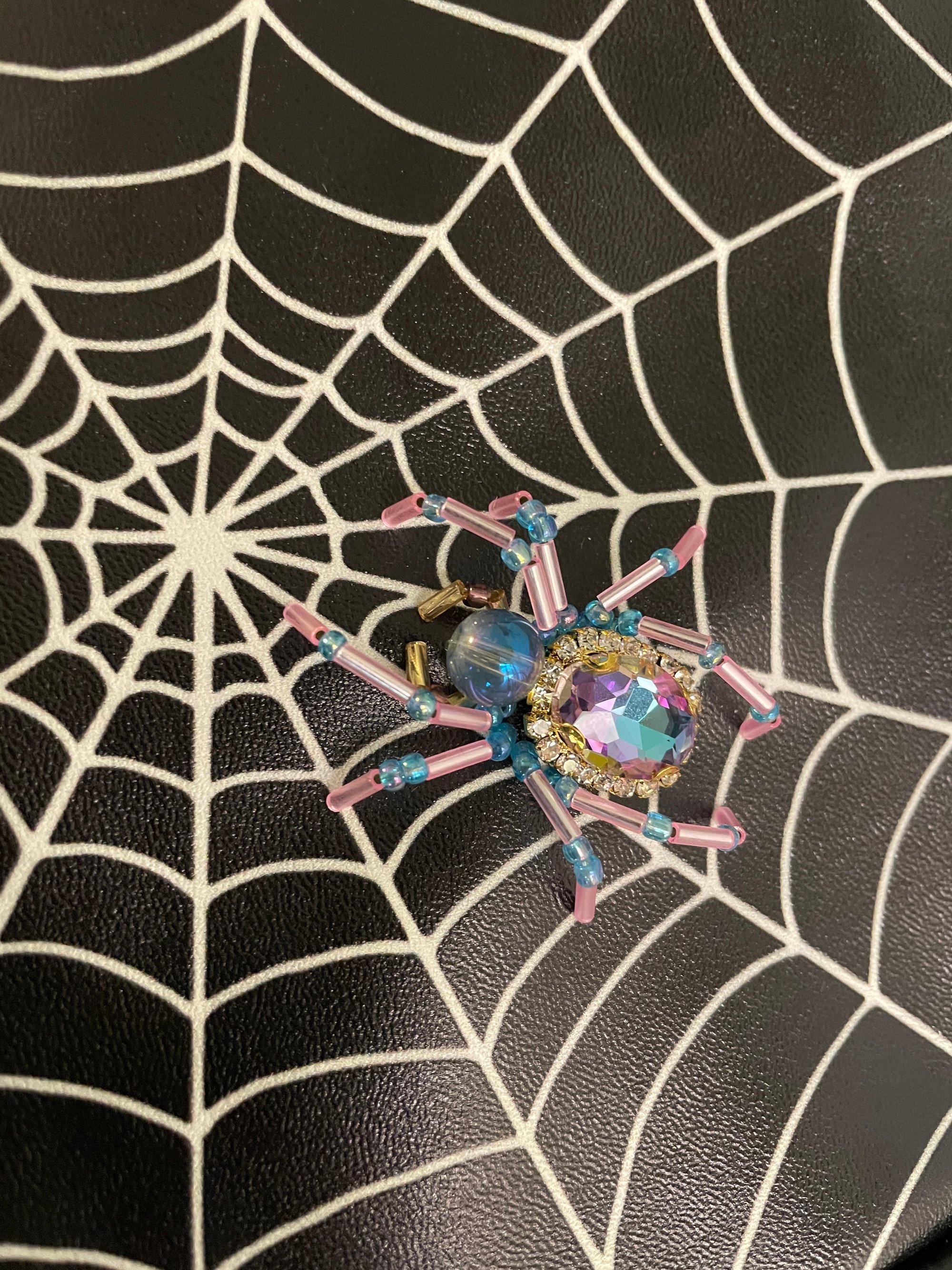 Soft fabric purse with metal chain strap. Hand embroidered gem and bead spider.