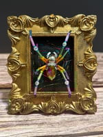 A series of rainbow legged hybrid spiders featuring dimensional glass bodies, sparkling webs, and ornate dry brushed mini frames.